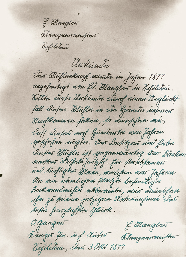 Handwerkerurkunde ausgestellt 1877 durch den Klempnermeister Mangler aus Schildau